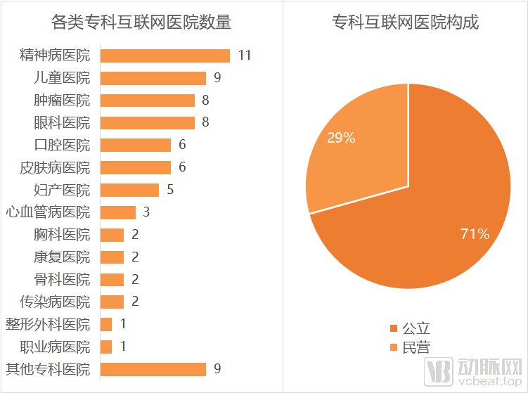专科互联网医院构成情况,资料来源:国家卫健委、各地卫健委以及主流媒体报道,动脉网整理制图