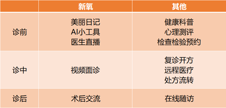 此前,新氧平台也覆盖了诊前、诊中和诊后服务。诊前,新氧通过美丽日记、多种检测小工具等产品促进用户消费决策;诊中,新氧通过视频面诊进行直接的医患沟通,但由于不能开处方,用户如有开药需求只能到线下,这个环节主要是解答患者疑惑,增加医患之间的了解,其最终目的还是在于促进消费决策;诊后,用户可通过新氧平台进行术后交流。不难看出,新氧此前的服务环节与普通互联网医院已有较多相似之处。只是新氧此前在诊中环节涉足还不深,获得互联网医院资质后,新氧能通过复诊开方更完整地将诊前、诊中和诊后全流程连接起来。