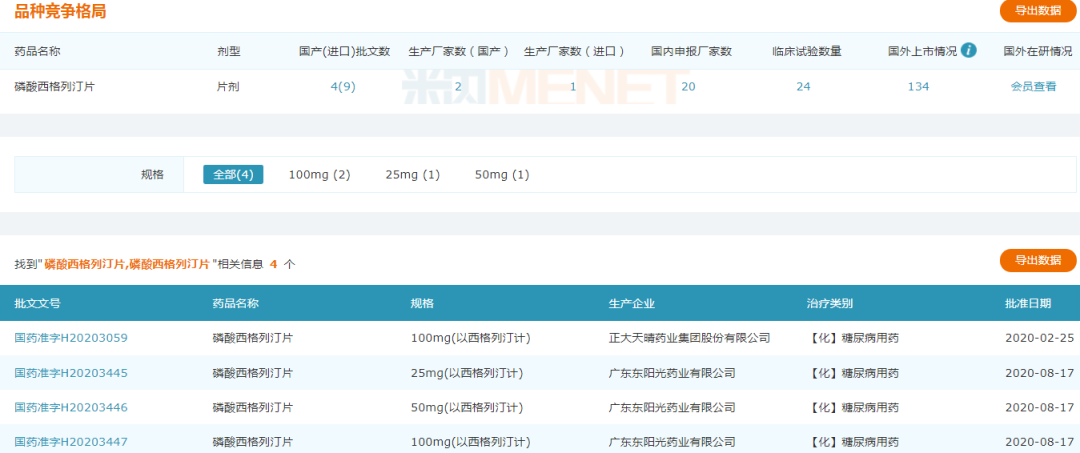 今年2月,磷酸西格列汀片正大天晴药业以首仿获批;8月,广东东阳光药业成为第二家获批的仿制药企业。而两家企业均以仿制4类获批,视同通过一致性评价。