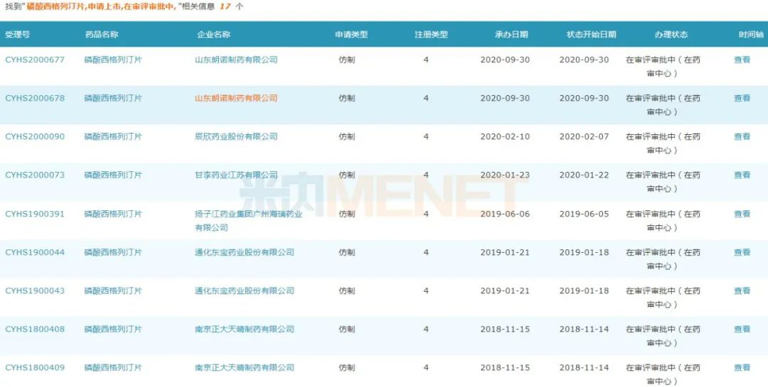 近日,CDE官网显示,山东朗诺制药的磷酸西格列汀片仿制4类上市申请获得受理。米内网数据显示,2019年中国公立医疗机构终端磷酸西格列汀片销售额超过9亿元,生产企业仅有默沙东。今年2月,正大天晴药业以首仿获批;8月,广东东阳光药业成为第二家获批的仿制药企业。截至目前,该产品已有扬子江药业集团广州海瑞药业、辰欣药业、石药集团欧意药业等10家企业以仿制4类提交上市申请在审评审批中。